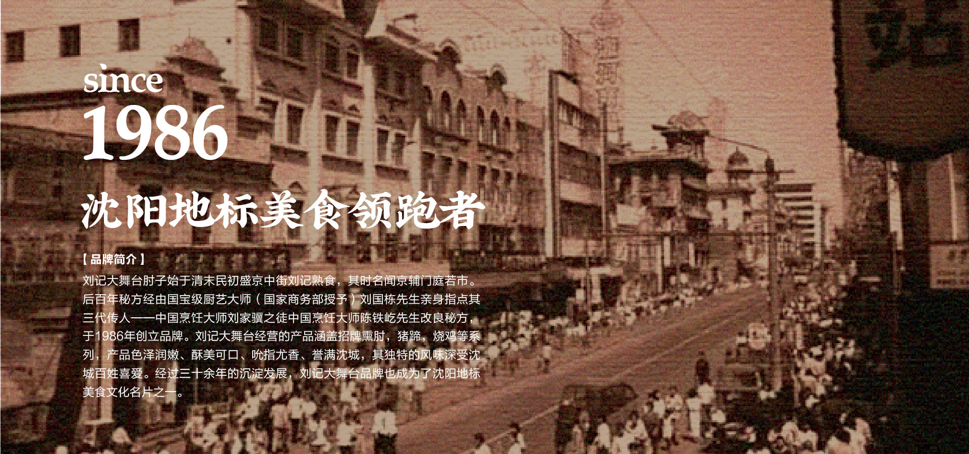 盛京,昔乃大清王朝發(fā)祥之地。劉記大舞臺肘子始于清末民初盛京中街劉記熟食,其時名聞京輔門庭若市。后百年秘方經(jīng)由國寶級廚藝大師(國家商務(wù)部授予)劉國棟先生親身指點其三代傳人——中國烹飪大師劉家驥之徒中國烹飪大師陳鐵屹先生改良秘方,于1986年創(chuàng)立品牌。劉記大舞臺經(jīng)營的產(chǎn)品涵蓋招牌熏肘,豬蹄,燒雞等系列,產(chǎn)品色澤潤嫩、酥美可口、吮指尤香、譽滿沈城,遂成古今絕味,其獨特的風味深受沈城百姓喜愛。經(jīng)過三十余年的沉淀發(fā)展,劉記大舞臺品牌也成為了沈陽地標美食文化名片之一。